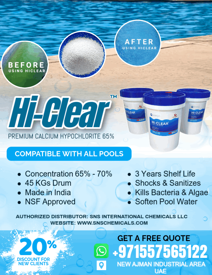 SNS International Chemicals LLC is proudly supplying Hi-Clear™ (Calcium Hypochlorite 65%-70% Granular) also known as Swimming Pool Chlorine Powder in the UAE & GCC region since 2021.